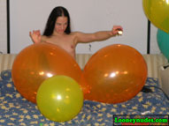 CAngelina Marie is simply adorable. With long, dark hair, going all the way down to her waist and a fearless attitude toward balloons and the loud booms they make, she is a combination that is tough to beat. She may, indeed, be one of the last videos we offer here on Looneynudes, but rest assure it is one of the best. She blows to pop with her might lungs, she sit pops with her cute butt, and she employs tools like the pump, helium tank, fire and pins to also bring be bangs to otherwise quiet balloons. Walking into her balloon room, she immediately notices that there is not to satisfy her craving. She wishes there would be more, and right on cue a parade of balloons drops from the ceilining and envelopes her. Her wish has come true and now the real fun can begin. Be sure to click on the film reel below for some sample clips from the video.
