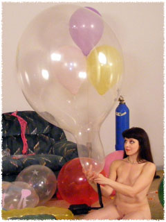 Beverly has given herself the task of blowing up a room of large balloons to their fullest and resist the urge to pop them until the room is full. Each balloon has to be inflated to its max. She sometimes blows the balloon up. lets the air out, and then reinflate it hoping to stretch it even further. Beverly is an incredible popper and it takes all her will power to resist the urge of cause some big booms. Of course, since the balloons are pushed to the max, some go off like booms on their own, just adding to Beverly's excitement. The room gets full of 16"s, 24"s, 36"s, big airships and Tilly Workers. Finally all the hard work, sexy talk and will power pay off and Beverly has a room full of incredibly tight huge balloons. Now it is time to pop them. Beverly used removable clips to keep the air in the balloons and that means she can easily put the balloons to her lips and blow them up more and make them explode. Be sure to click on the film reel below for some sample clips from the video.