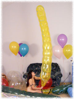 Beverly has some of her biggest balloons ever in her new video. Her goal is to make the balloons as big as possible before the explode. All the balloons are prestretched, including the necks of the balloons. First Beverly blows up the balloons really tight and ties them off. While the latex of each balloons "relaxes" and stretches itself out a bit, she continues blowing up others. Then she comes back around, unties the balloons that have been already blows up and adds more air to make them tighter. She tried to get every bit of stretch out of the latex she can. Its a good thing we have 16' high ceilings in the studio. She needed every last inch for some of these balloons. Naturally in the end all the balloons explode from the pressure. Because of all the time she spends trying to max out each balloons, this video is over 90 minutes of intense balloon popping pleasure. Be sure to click on the film reel below for some sample clips from the video.