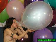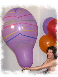 Lynn has a "special thing" for big balloons. Walking into a room filled with big balloons, Lynn first tests them out by sitting and bouncing on them. She notices a few smaller balloons that don't quite fit in and decides to dispose of them with a good squeeze and her heels. After some initial play with the big balloons, Lynn gets the craving to untie one to see how big it will get before popping by putting it on the pump resulting in a nice boom. Next Lynn sits on one of the big balloons and decides to blow up a 16" Unique until it pops. The pop was a lot of fun for her so she grabs a big clear balloon and bounces up and down on it until it explodes causing her to come crashing down onto the floor. Things are starting to heat up now, and after removing her clothes and having a bit of play, Lynn unties a big crystal purple balloons and blow more air into it. It feels good putting the big balloon to her lips so she decides to keep blowing and blowing until the large purple balloon explodes into many shreds. Next up is a South American 24" that makes for some good bouncing. While bouncing Lynn grabs another balloon and begins blowing it up until one last deep breath shatters the balloon with a nice pop. After a quick break to re-energize herself, Lynn returns to the balloon room with a glass of wine ready to continue on. She reclines back in a big green balloon, grabs the pump and a bag of balloons, and starts doing some rapid blow to pop on the pump. After eleven ear shattering booms, she once again focuses her attention on the big balloons. Lynn takes both the big green balloon and the SA 24", unties them and blows them up on the pump until they burst. The shreads are so big that she jokes by using one piece as a bra. A bit tired of the pump, she then unties the big red balloon and starts blowing it up more herself, forcing more air into it until she creates another big explosion. After some more sitting and blowing to popping of the big balloons, Lynn saves the best for last. The huge 72" monster lavender balloon has been tempting her the entire time. She first unties the beast and gives it some quick blows to get a feel for it. Lynn then lays down on the floor with the huge balloon and attaches it to the pump. On her back she looks up at the massive balloon that continues to grow above her. As it gets bigger and bigger, almost touching the ceiling, she wraps her legs around the beast and gives herself a bit of extra pleasure. When the inevitable explosion comes, the room shakes leaving Lynn completely satisfied. Be sure to click on the film reel below for a sample clip from the video.